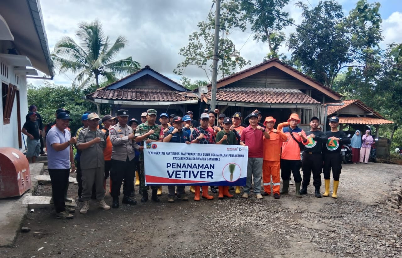 Ucapan terimakasih kepada BPBD Kabupaten Banyumas yang telah menyediakan bibit rumput Vetiver untuk pencegahan bencana alam tanah longsor dan kepada seluruh stakeholder yang hadir pada kegiatan pagi hari ini dalam program memperbaiki kualitas air dan melindungi infrastruktur tanah di desa setempat.
