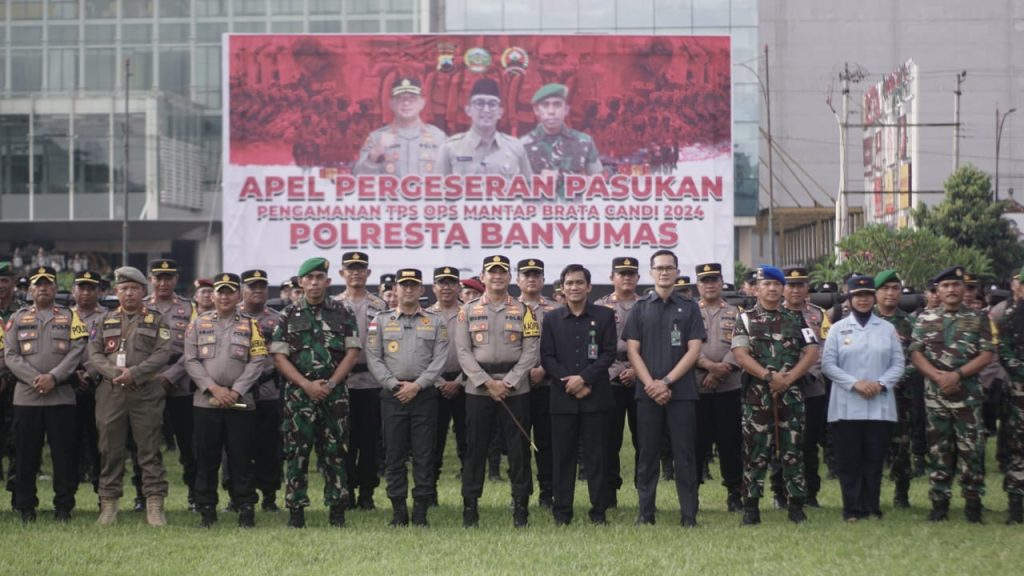 Banyumas – Kapolresta Banyumas Kombes Pol. Edy Suranta Sitepu. S.I.K., MH., beserta Dandim 0701/Banyumas Letkol Arm Ida Bagus Adi Purnama S.T., M.Han dan Pj. Bupati Banyumas Hanung Cahyo Saputro, S.STP.,M.Si., pimpin apel gelar pasukan dalam rangka Apel Kesiapsiagaan Pengamanan Pemilu 2024 dan pergeseran pasukan serentak yang diselenggarakan di alun-alun  Purwokerto Kecamatan Purwokerto Timur Kabupaten Banyumas. Selasa 13/02/2023.