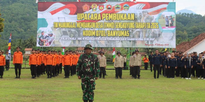 Banyumas – Kodim 0701/Banyumas Korem 071/Wijayakusuma menggelar Upacara Pembukaan TNI Manunggal Membangun Desa (TMMD) Sengkuyung Tahap l Tahun Anggaran 2025 di Lapangan Desa Kaliputih Kecamatan Purwojati Kabupaten Banyumas, Rabu (19/02/2025).