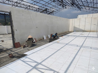 Memasuki tahap terkini, pengerjaan fisik bangunan menunjukkan kemajuan yang sangat positif. Fokus utama para pekerja hari ini adalah melaksanakan tahap pemasangan keramik di seluruh area lantai bangunan.